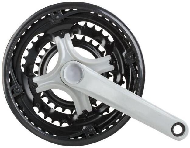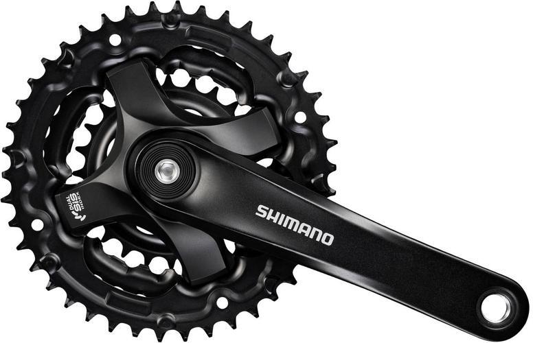 Shimano Tourney FC-TY501 négyszögtengelyes MTB hajtómű 24-34-42T, 170 mm, alumínium, fekete FC-TY501 belépő kategóriás négyszögtengelyes hajtőmű hobbi MTB, városi kerékpárokra, nadrágszár védő nélkül. Négyszögtengelyes tengelyrögzítés 170 mm-es alu hajtókar, szegecselt acél lánckerekekkel (nem bontható) 3 x 6-7-8 sebességes rendszerekkel kompatibilis Acél lánckere