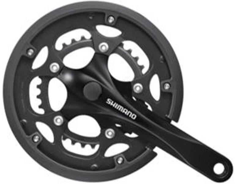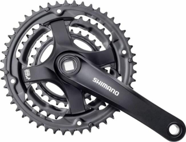 Shimano Tourney FC-TY501 négyszögtengelyes trekking hajtómű 28-38-48T, 170 mm, alumínium, fekete FC-TY501 belépő kategóriás négyszögtengelyes hajtőmű trekking, városi kerékpárokra. Négyszögtengelyes tengelyrögzítés 170 mm-es alu hajtókar, szegecselt acél lánckerekekkel (nem bontható) 3 x 6-7-8 sebességes rendszerekkel kompatibilis Acél lánckerekek Fogszám kiosztás: 28