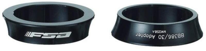 Conical alloy spacers which allow BB386EVO cranksets to fit into 68mm wide BB shells with BB30 or PF30 bearings installed. The alloy spacers increase the effective width of the PF30 or BB30 BB shell to match the 86.5mm spacing of the BB386EVO crankset.