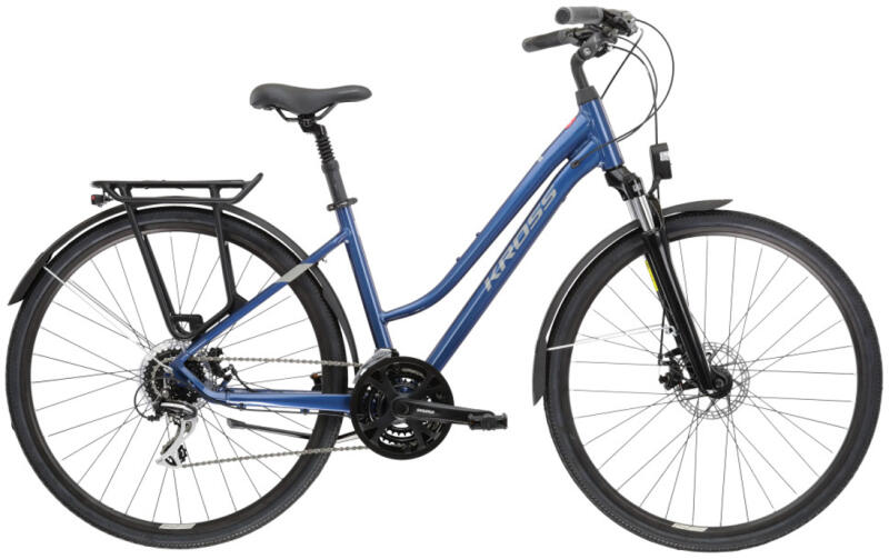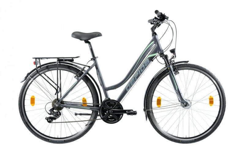 Alu vázas női trekking kerékpár, 24 sebességes Shimano váltóval, teleszkópos villával és vázban vezetett bowdenekkel. Teljesen felszerelt, kiválóan alkalmas túrázáshoz vagy városi használatra, állítható dőlésszögű kormány gondoskodik a komfortos használatról. Alu 6061 váz SR Suntour NEX 63 mm teleszkópos villa Radius Mechanikus tárcsafék 3x8 sebesség, elől: 48/38/