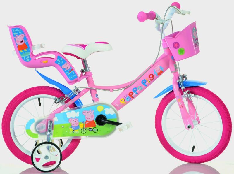 A DINO Bikes - Gyermek kerékpár 16" 164R-PGS - PEPPA PIG , a Dino Bikes Italy által gyártott kerékpár kis kerékpárosok számára, akik kedvenc babájukat szeretnék magukkal vinni. Kiváló minőségű, levegővel töltött abroncsok dróthálós felnivel, szabadonfutó sebességváltóval Pofafék mindkét keréken. Segédkerekekkel van felszerelve. A kerékpár babatartóval és kosárra