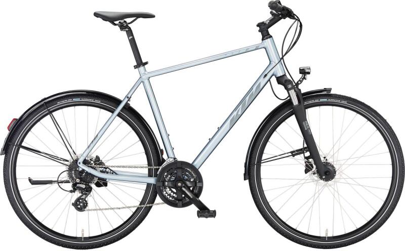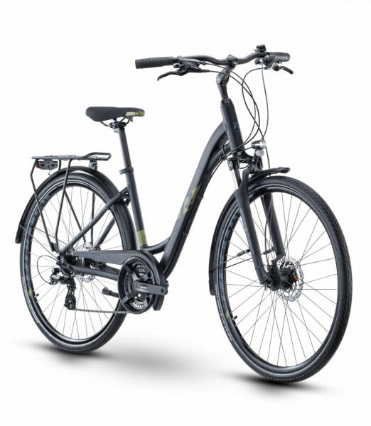 Alu vázas férfi trekking kerékpár hidraulikus tárcsafékkel, agydinamós világítással, sárvédőbe integrált csomagtartó rögzítéssel és állítható dőlésszögű kormányszárral. A teszt kerékpár keveset futott, első sárvédője és külső gumija eltér a gyári felszereltségtől. Alu 6061 váz SR Suntour NEX DS teleszkópos villa Shimano hidraulikus tárcsafék 3x7 sebess