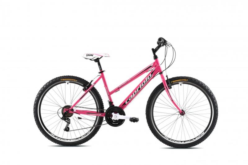 Női hegyi kerékpár, ajánlott magasság 175-185 cm, 110 kg teherbírás, Shimano Tourney FD-TZ500 és RD-TZ21 első és hátsó váltó, Shimano SL-RS-35 váltókar - 18 sebesség fokozat, Logan V-fékek, Mitas Saurus V61 gumik. Rózsaszín és fehér. A Capriolo Passion Lady női hegyi kerékpár 26"-os kerekekkel büszkélkedik , így megfelel nehezebb terepen és karbantartatlan kerékpárut