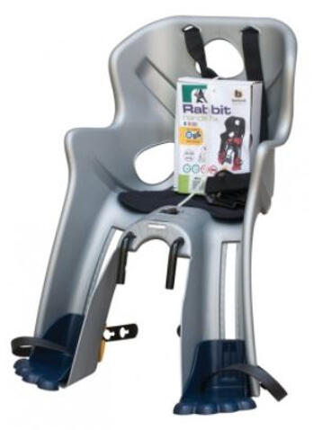 Bellelli Rabbit Multifix gyerekülés előre, adapteres, ezüst-kék Első gyermekülés. Max. teherbírása 15 kg, vagy 3-4 éves korig. Egy kézzel ki-/becsatolható biztonsági öv, tágas üléstér, pozícionálható lábtartó. Könnyen tisztítható, mérgező anyagoktól mentes, jól szellőző műanyag váz, mosható szivacsbetétek. Multifix: Egyféleképpen szerelhető tartóbilincs, am