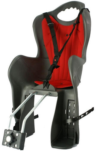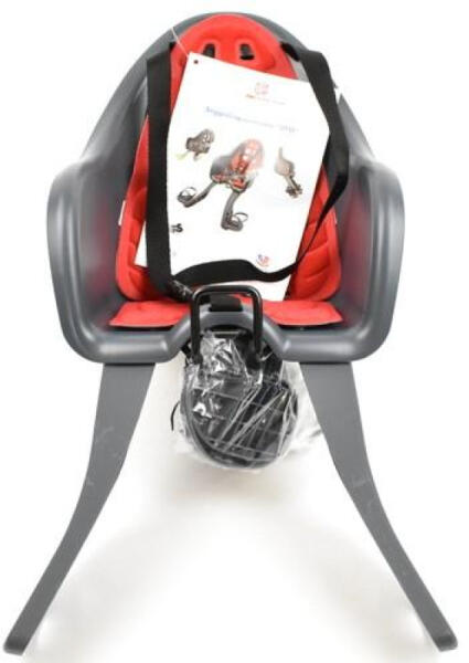 HTP Kiki gyerekülés előre, első rögzítésű, sötét szürke-piros Felszerelés lehetséges a homlokcsőre (csak olyan kerékpárokra, ahol az alső- és felsőcső között van hely a konzol rögzítéséhez). 42 mm magas a konzol, akkora távolságnak kell lennie az alsó- és felsőcső között Acél csöves konzol, mely segít az útegyenletlenségek simításában Különféle csőmér