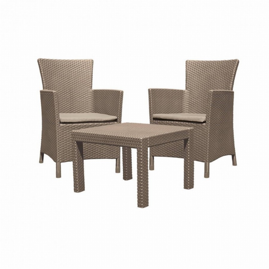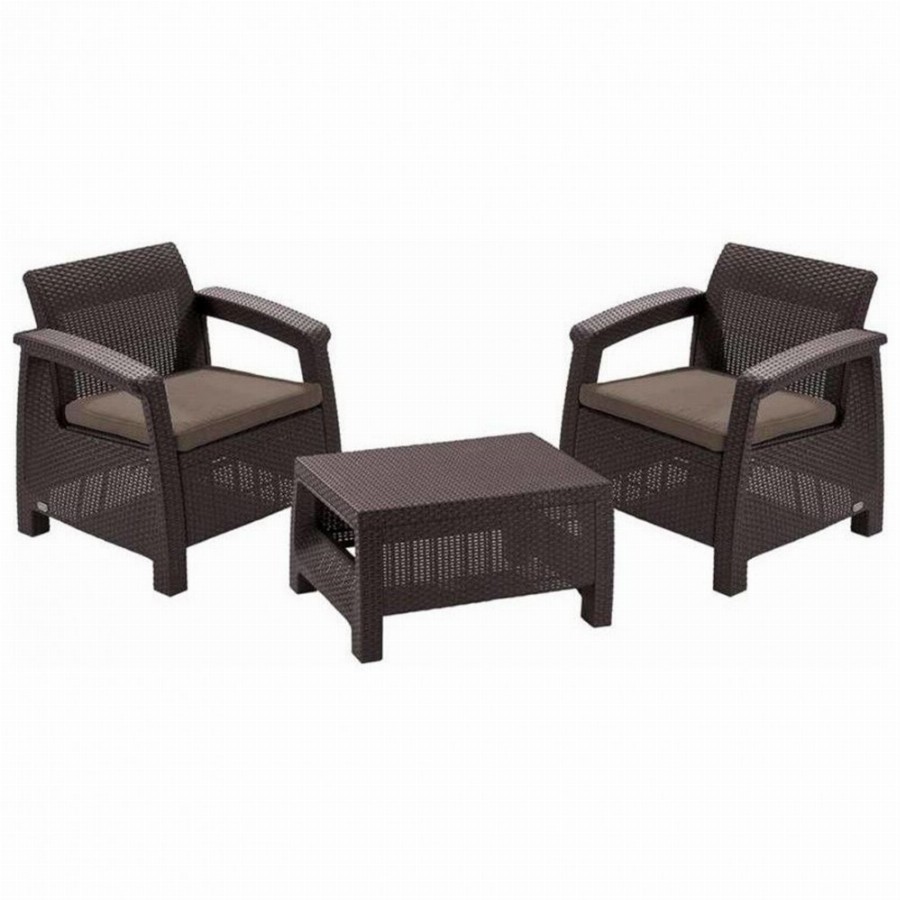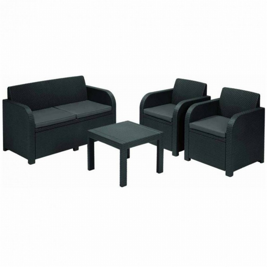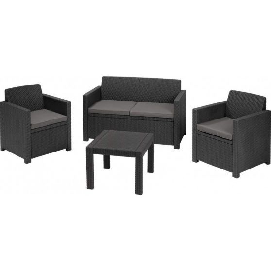 KETER SALEMO polyrattan kerti bútor garnitúra (kétszemélyes) - grafit A SALEMO típusú bútor garnitúra elegáns, modern és retro stílusú rattan utánzatú öntött műanyagból készült. A két fotelből, egy kanapéból és egy funkcionális asztalból álló szett kiválóan ellenáll az időjárási viszonyoknak és az UV sugárzásnak is. A szettet kültéren és beltéren egyaránt