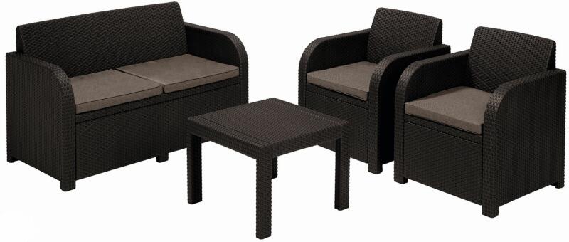 ALLIBERT GEORGIA műrattan kerti bútor szett, barna/szürke-bézs 216741 (17199879) Georgia - rattan imitáló bútor szett két fotellel, kétszemélyes kanapéval és egy négyszögletes asztallal. A bútor szett ideálisan beleillik minden ház körüli térbe, ahol ideális helyet teremt a szabad levegőn való pihenéshez. A termékekhez stílusos színű puha párnákat mellékelünk. Nagyo