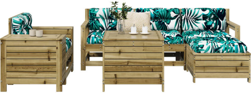 Ez a fenyőfából készült kerti ülőgarnitúra ideális választás ahhoz, hogy pihenjen, élvezze a kellemes időjárást, szundikáljon egyet vagy beszélgessen családjával vagy barátaival. A kanapészett tömör fenyőfából készült, így masszív és stabil. Ez a garnitúra szilárd felépítésű és kevés karbantartást igényel. A párnák extra kényelmet biztosítanak. Ez a tá