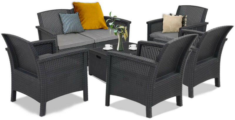 Gyártó: Leziter Modell: Venus II Big 6 személyes grafit LBIVENGR4 LBIVSZ-GRA 2 Leírás: Olaszországban készült ez a grafit színű, kényelmes és elegáns bútor szett. négy 63 x 64,5 x 76 cm-es fotelt, egy 117 x 64,5 x 76 cm-es két személyes kanapét és egy 60 x 54,5 x 40,5 cm-es négyszögletes asztalt foglal magába. A Venus II Big kerti bútor szett előnyei: Nagy befogadóképess