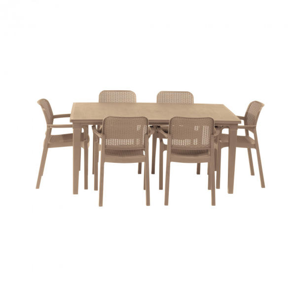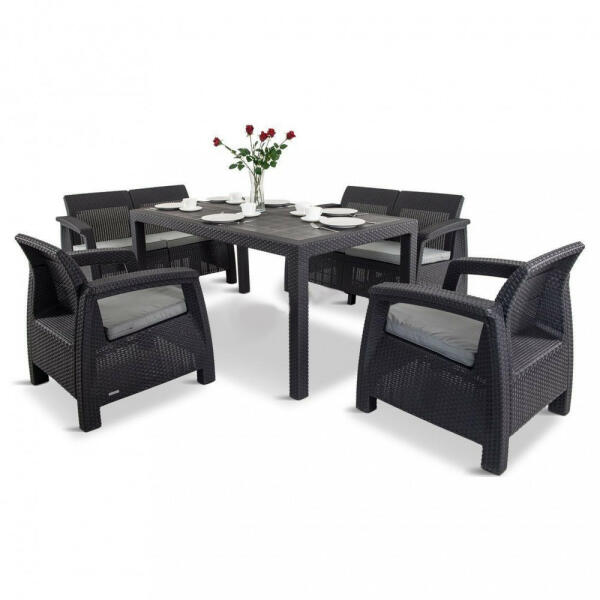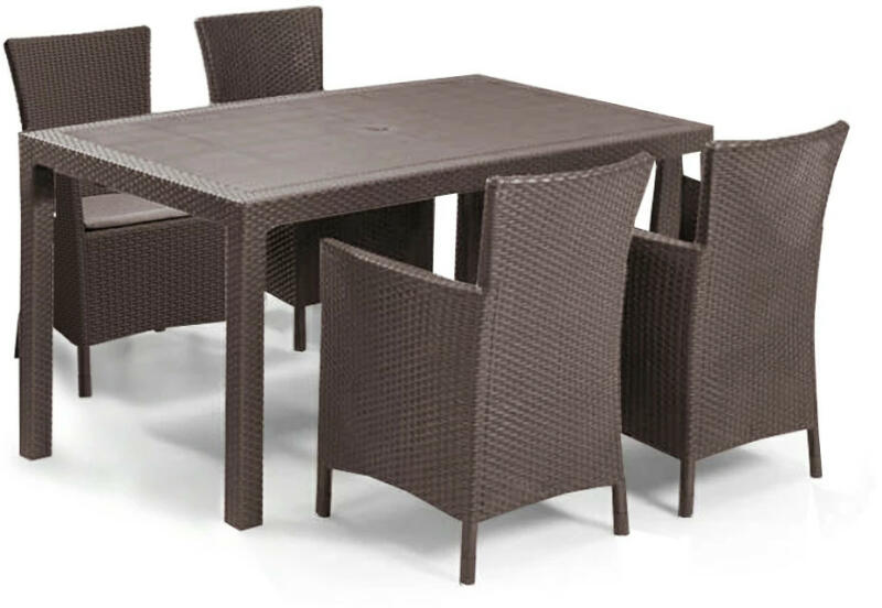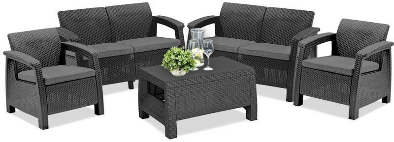 A Corfu Fiesta bútor szett felülete rattant imitáló anyagból készült. A szett két fotelt, két darab kétszemélyes kanapét és egy nagy négyszögletes asztalt tartalmaz. A szett kiválóan alkalmas étkezésekhez. Tökéletes nagy felületek berendezésére, kiváló családi grill- vagy kerti partik rendezésére. A bútorok tartósak és ellenállnak az időjárás viszontagságainak,