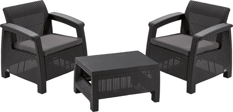 Gyártó: Curver Modell: Corfu Weekend kerti bútor garnitúra Leírás: Szépség és elegancia egy szettben. A szerkezet kompakt formája és a szett optimális mérete lehetővé teszi kisebb kertek és erkélyek berendezését is. A szett egy asztalt és két puha párnával rendelkező fotelt tartalmaz. A termék eleganciája, kényelme és a vonalvezetése garantálja a kellemes pihenést a