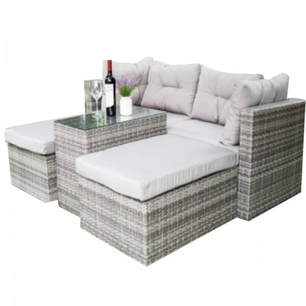 City sarok kerti bútor garnitúra Termékjellemzők Ez a szett egy sarok ülőgarnitúrát és egy asztalt foglal magába, ami elegendő helyet biztosít 5 ember számára. Igényes kivitelezésével és kellemes hangulatával biztosan tetszeni fog mindenkinek. Szerkezetének köszönhetően könnyen mozgatható, de mégis nagyon stabil és kényelmes ülőhelyeket biztosít. Ellenáll az időjá