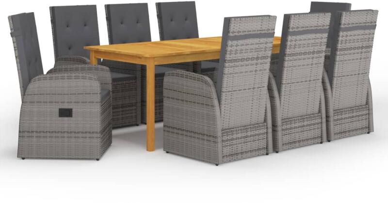 vidaXL 9 részes szürke kerti étkezőgarnitúra Csempésszen otthonába egy impozáns, odaillő esztétikai megoldást, és fogyassza el vacsoráját kényelmesen a kertben ezzel az étkezőszettel! Az étkezőasztal olajbevonatú, tömör akácfából készült, így stabil, tartós és könnyű karbantartani. A porszórt acélváz polyrattan burkolattal lett ellátva, ezért ezek az étkezősz