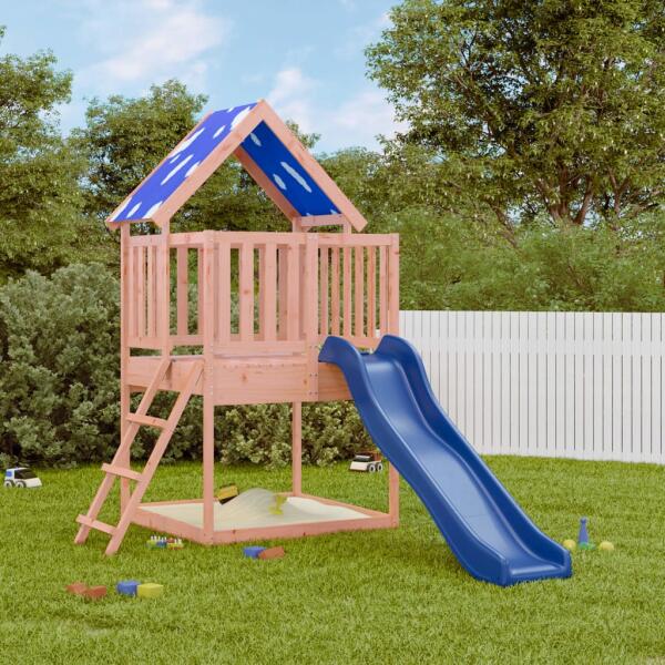 Szeretné, ha gyermekei szabadon játszhatnának otthon? Ez a fából készült játszószett varázslatos kalandok játszóterévé varázsolja kertjét! Tartós anyag: A kerti játszószett váz tömör duglászfenyőből készült. A duglászfenyő az erősségéről és tartósságáról ismert. Gazdag vörösesbarna színe és egyedi erezetmintája meleg és természetes hangulatot áraszt. J