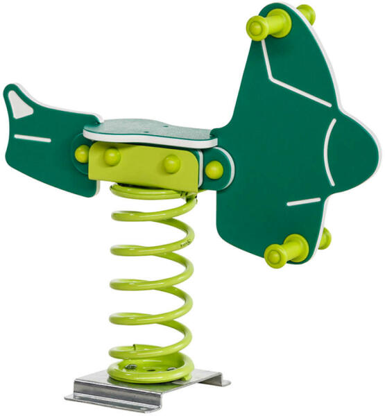 Egyedi tervezésű, zöld színű, repülő alakú rugós játék. HDPE műanyagból készült időjárásálló, hosszú élettartamú játék, mely otthoni és közterületi felhasználásra egyaránt alkalmas. A rugós játék megerősített műanyag fogantyúi és lábtámaszai csúszásmentes profillal vannak ellátva. Acélból készült, 1,8 cm vastag, 40 cm magas, 17 cm átmérőjű, lebet