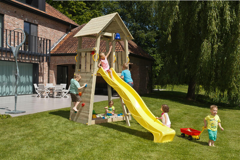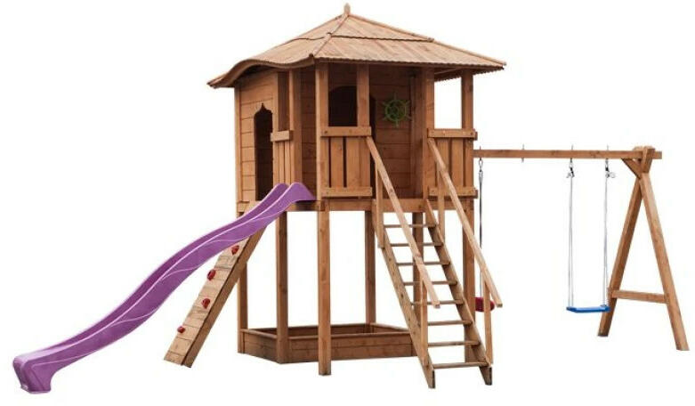 Szeretné, ha gyermekei szabadon játszhatnának otthon? Ez a fából készült játszószett varázslatos kalandok játszóterévé varázsolja kertjét! Tartós anyag: A kerti játszószett váza tömör fenyőfából készült. A tömör fenyőfa az erősségéről és tartósságáról ismert. Egyenes erezete és jellegzetes csomói hozzájárulnak rusztikus varázsához. Stabil fa váz: A ker