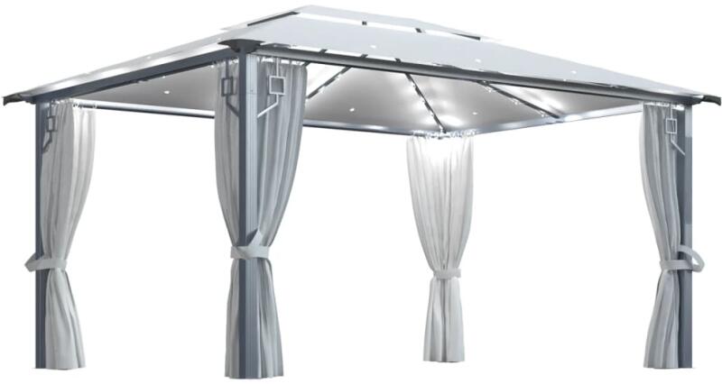 vidaXL tópszínű alumíniumpavilon függönnyel/LED fényfüzérrel 4 x 3 m Ez a függönyökkel felszerelt kerti pavilon klasszikus eleganciát sugároz. Tökéletes védelmet nyújt a napfény ellen kültéri események alkalmával: szabadban történő vacsorázáskor, grillezéskor, családi összejöveteleken és sok más rendezvényen. A PA-bevonatú oxfordból készült tető elrejti a sz