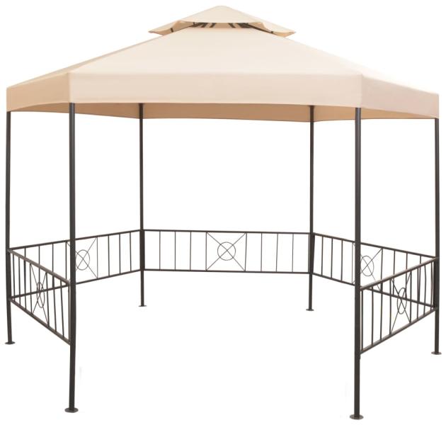 vidaXL hexagonális bézs kerti pavilon 323 x 265 cm Ez a kerti pavilon klasszikus eleganciát sugároz. Tökéletes védelmet nyújt a napfény ellen kültéri események alkalmával: szabad ég alatti vacsorákon, grillezéskor, családi összejöveteleken és sok más rendezvényen is. A vízálló tető PA (poliamid) bevonatú poliészterből készült. A váz erős, porszórással felülkezel