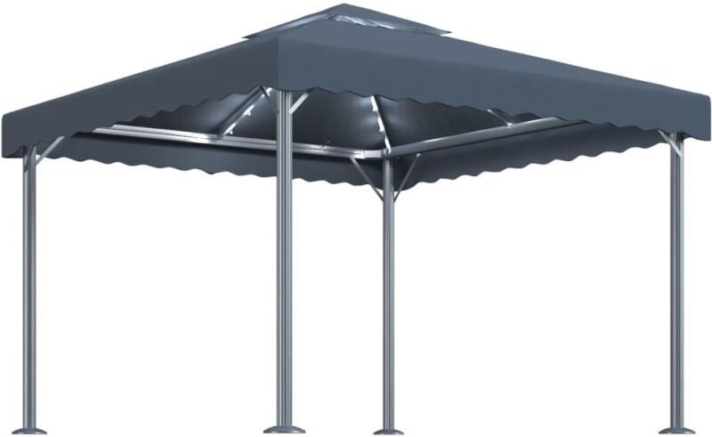 vidaXL antracitszürke alumíniumpavilon LED fényfüzérrel 300 x 300 cm Ez a klasszikus eleganciát sugárzó kerti pavilon tökéletes védelmet nyújt a napfény ellen kültéri események alkalmával, például szabadban történő vacsorázáskor, grillezéskor, családi összejöveteleken és egyéb alkalmakkor is. Az oxford szövetből készült és poliamid festékkel ellátott tető meg
