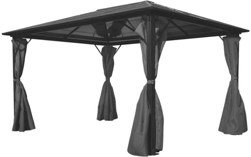 vidaXL alumínium kerti pavilon antracitszürke függönnyel 400 x 300 cm Ez a függönyökkel felszerelt kerti pavilon klasszikus eleganciát sugároz. Tökéletes védelmet nyújt a napfény ellen kültéri események alkalmával: szabadban történő vacsorázáskor, grillezéskor, családi összejöveteleken stb. A 6 mm vastag, UV sugárzásnak ellenálló, PC lemezből készült tető elrejti