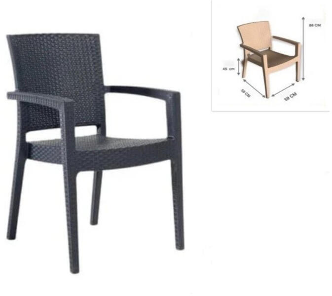 Kerti szék erősített speciális műanyag vázzal és polirattan fonattal. Az XXL egy kényelmes szék, fonott rattan üléssel. Tartós kiegészítő bútor a kerthez, a teraszhoz, az erkélyhez és a konyhához egyaránt. A keret szilárd acélból, az ülés és a hátsó rész polietilénből készül. Ennek eredményeként ez a termék ellenáll az időjárási viszonyoknak és a mechanikai
