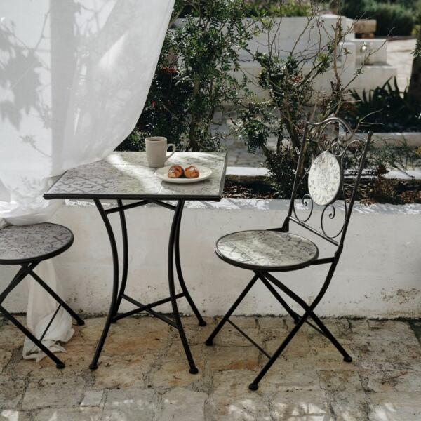 Erice négyzetes asztal + 2 összehajtható szék 38x92x46 cm; C: 60x75 cm Fedezze fel kertjének varázsát kovácsoltvas kerti bútorainkkal! Kínálatunkban olyan stílusos darabok szerepelnek, melyek gondosan megválogatottak, hogy otthonos környezetet teremtsen a szabadban. Az asztalok és székek mozaik mintákkal vannak díszítve, amelyek egyedi stílust és eleganciát kölcsönöznek ke