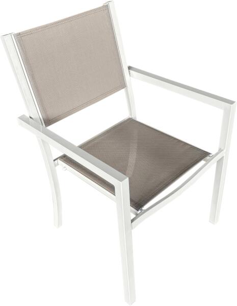 Anyag: acél/ műszövet Kialakítás: fehér/világosszürke Méretek (SzxMéxMa): 56x62x86 cm Ülés magassága: 39 cm Ülés mélysége: 46,5 cm Háttámla magassága: 47 cm Teherbírás: 90 kg Rakásolható Kerti Modern dizájn Kartámasszal Egészben szállítva