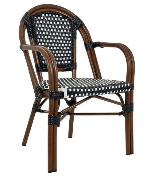 CAFE PARIS ARM barna rattan szék. Időtlen, könnyű karfás szék, amely kiegészíti mind a belső teret, mind a kertet. A párizsi kávézók stílusa ihlette. Beltéri és kültéri használatra egyaránt használható. Teljesen alumíniumból készült, diófa hatású. Az ülés és a háttámla UV-álló szintetikus fonott fonott anyagból készült. Ráadásul akár 10 darabig is egymásr
