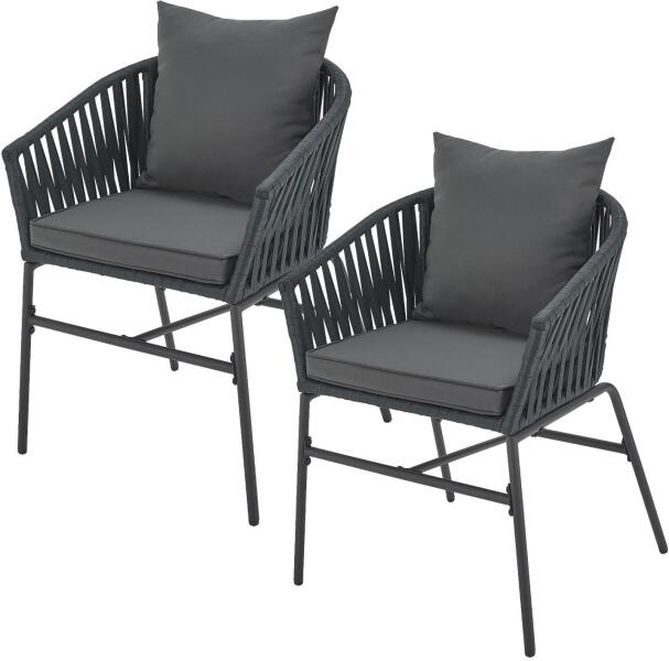 Stílusos fotelkészlet a maximális kényelemért a teraszon vagy az erkélyen Stílusos és elegáns, 2 kötélszékkel kiemeli teraszát vagy erkélyét. A kötélháló és a durva kárpitozás különleges üléskényelmet biztosít. A szerkezet rendkívül robusztus, a porbevonat pedig ellenáll a korróziónak és a karcolásoknak. Az elasztikus kábelháló, valamint a durva ülő- és há