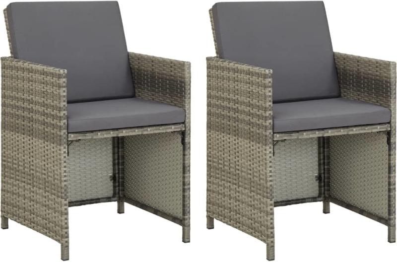 vidaXL 2 db szürke polyrattan kerti szék párnával Ez a stílusos polietilén rattan kerti székgarnitúra kertje vagy terasza gyöngyszeme lesz! Az étkezőszék könnyű és könnyen mozgatható. A politilén rattannak köszönhetően időjárásálló és könnyen tisztítható. A porszórt acélváz stabilitást biztosít. A vastag habszivaccsal töltött és víztaszító poliészterből k
