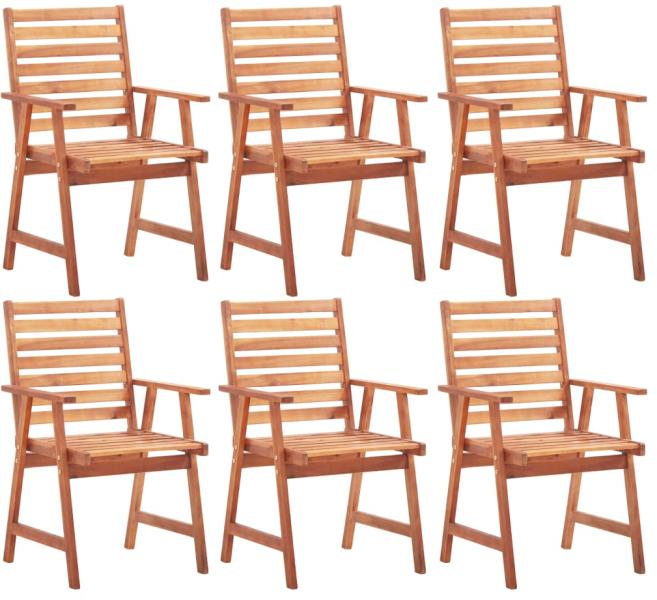 vidaXL 6 db tömör akácfa kültéri étkezőszék Modern étkezőszék szettünk természetes stílust csempész a kertjébe, teraszára vagy verandájára. Ez a fa szék szett nagyszerű választás szabadtéri étkezéshez. Az étkezőszékek minőségi akácfából, egy trópusi keményfából készültek, mely időjárásálló és rendkívül strapabíró, éveken keresztül használható.