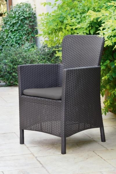 Modern, lapos fonású kivitelének köszönhetően az Allibert Miami kültéri széket könnyedén kombinálhatja különféle kerti asztalokkal. Modern, lapos fonású kivitelének köszönhetően az Allibert Miami kültéri széket könnyedén kombinálhatja különféle kerti asztalokkal. Az íves háttámlának, a kartámaszoknak és a mellékelt párnának köszönhetően ez a szék lesz ked