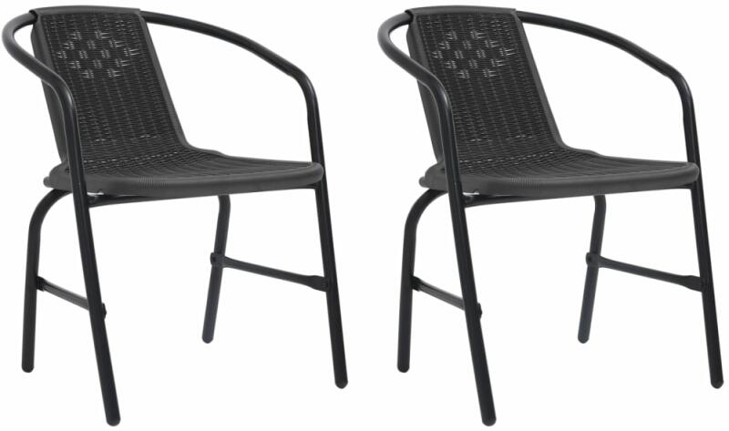 vidaXL 2 db műanyag rattan és acél kerti szék 110 kg Ez a rattan hatású kertiszék-szett elegáns és modern kialakítású, és kültéri környezete szemet gyönyörködtető darabja lesz. Az acélváznak köszönhetően a kültéri székek stabilak és erős tartásúak. A műanyag rattan ülések fokozzák az ülés kényelmét. Ráadásul a székek egymásra helyezhetők, így helytakar