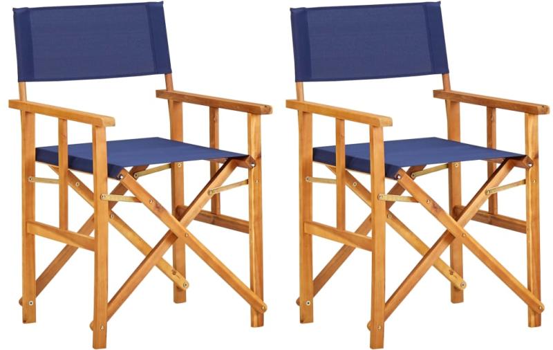 vidaXL 2 db kék tömör akácfa rendezői szék Az összecsukható rendezői szék elegáns megjelenéssel bír, és kényelmes ülőhelyet kínál kempingezéshez, strandoláshoz, sportoláshoz vagy más szabadtéri tevékenységekhez. A rendezői szék tömör akácfából készült, mely egy időjárásálló és strapabíró trópusi keményfa. A kiváló minőségű szövetből készült ül
