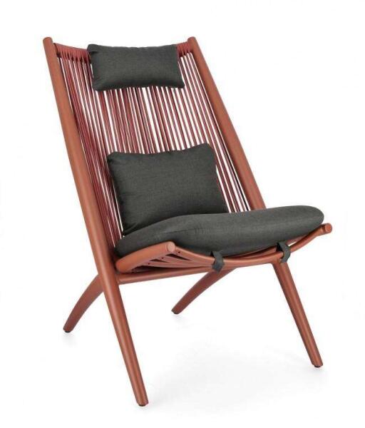 Az ALOHA kerti fotel speciális kialakításának köszönhetően akár órákon át kényelmes ülőhelyként szolgálhat a teraszon. A grafitszürke és piros fotel háttámláját UV-álló feketekötélből fonták, ezért könnyű esztétikusan elhelyezni a térben. Minimalista stílusú környezetben letisztult megjelenése jól érvényesülhet. A levehető párnák időjárásálló polié