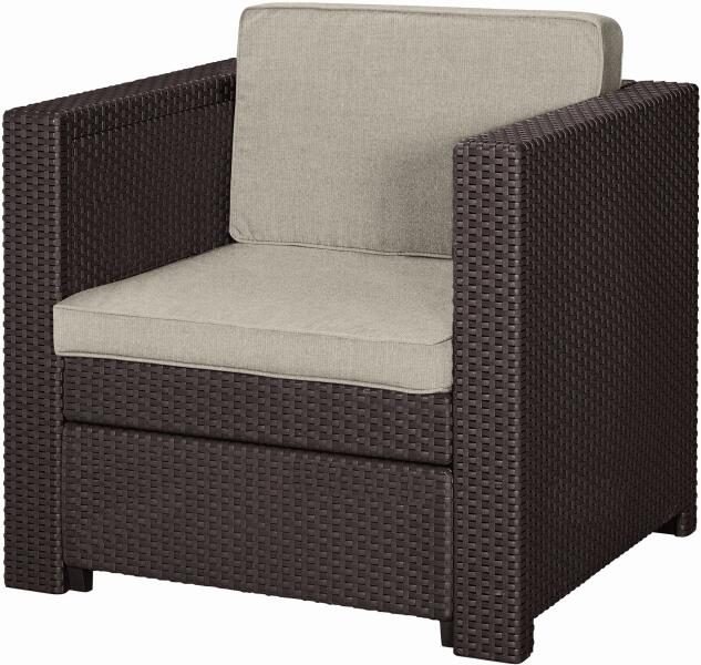 KETER PROVENCE műrattan kerti fotel, barna/bézs 258959 (17189413) A Provence armchair elegáns és kényelmes kerti fotel mely párnákkal együtt kapható. A színek gazdag választéka és a különleges, rattant imitáló mintázat a legigényesebb felhasználó ízlését is kielégíti. Az UV sugárzásnak és az időjárási körülményeknek ellenálló, kimagasló minőségű anyagból k