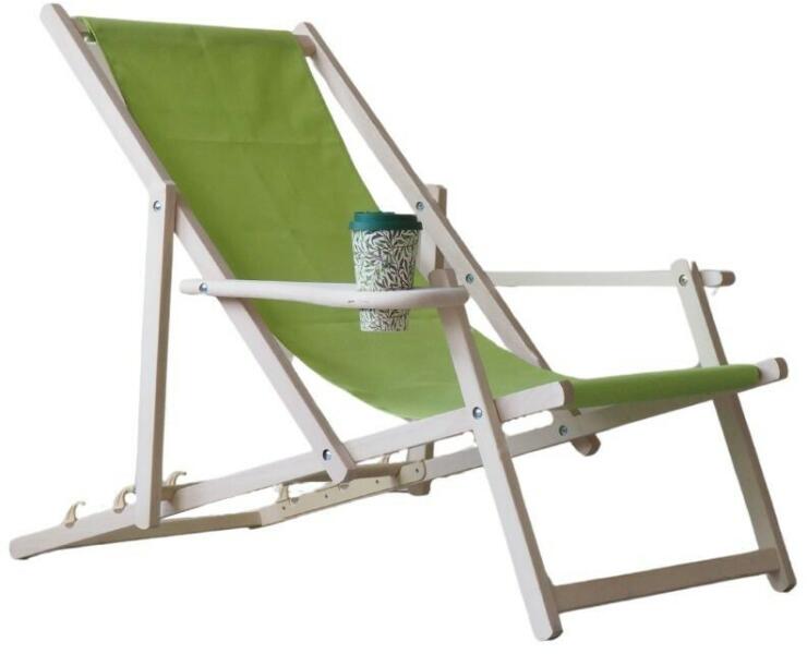 A fából készült nyugágy minőségi bükkfából készült. Ezáltal erős, tartós és stabil. Könyöktámasszal ellátott kényelmes karfák biztosítják a kényelmes ülést. A képen látható pohár nem része a csomagnak. A huzat erős és rugalmas anyagból készült, amely tökéletes kényelmet biztosít ülés közben. A vászon könnyen eltávolítható az összecsukható nyugágy
