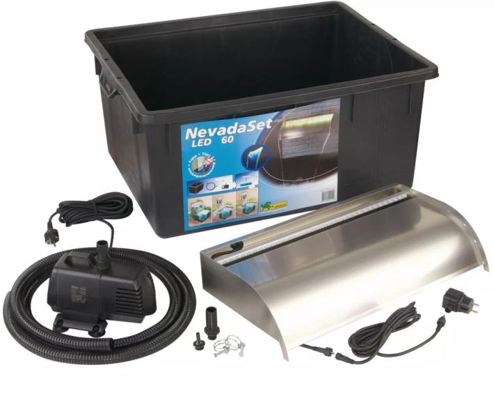 Ubbink Nevada rozsdamentes acél vízesés szett LED világítással 60 cm Ez a Nevada vízesés szett az Ubbink-tól minden olyan szükséges kiegészítőt tartalmaz, amire szüksége van egy csobogó létrehozásához: egy rozsdamentes acél vízesés, egy szivattyú, 1,5 méter hosszú tömlő és egy 150 literes tartály. A beépített LED-fények nagyszerű hangulatot teremtenek esténként.