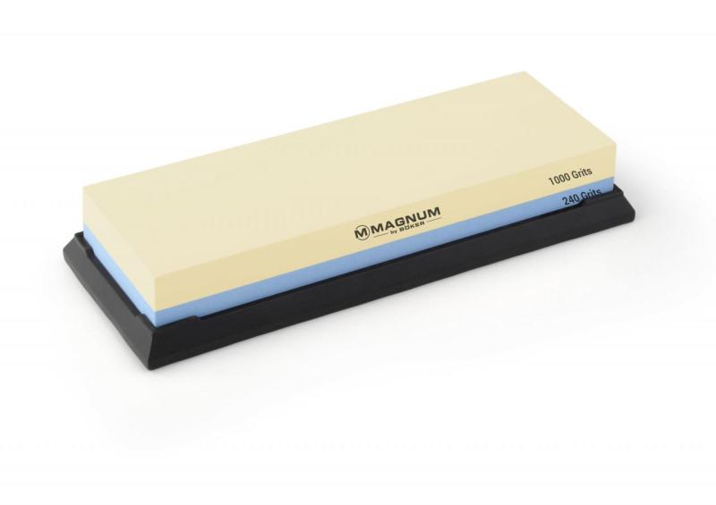 Böker Magnum vizes fenőkő 240-1000 grit Használat előtt vízbe kell helyezni a fenőkövet, hogy teljesen ellepje és addig áztatni vízben míg kis buborékok jönnek fel a vízből a fenőkőből. Kétoldalas kialakításának köszönhetően egy fenőkővel is borotva élesre fenhetjük késeinket. A mellékelt tartó biztosítja a csúszásmentes használatot. 240 és 1000 grit finomság