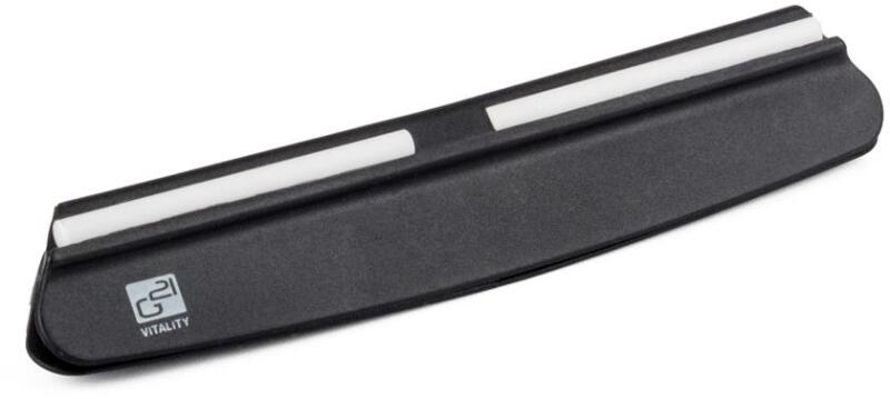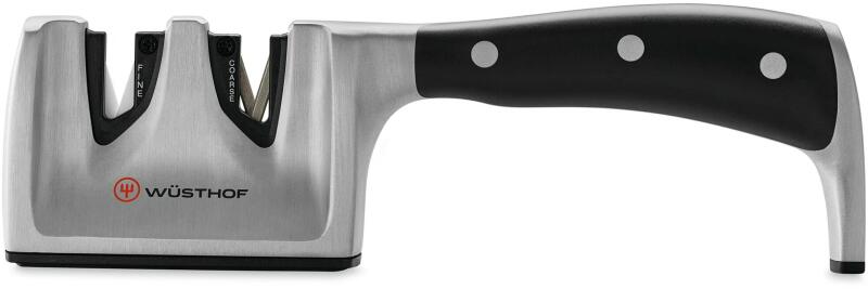 A Wusthof Ikon kézi késélező alternatívát kínál az acél vagy fenőkővel végzett élezés helyett. A kétlépcsős élezést egy gyémánt bemetszés biztosítja a durva élezést igénylő tompa pengék számára, míg a kerámia bemetszés a finom élezésre és az élezés finomhangolására szolgál. A fekete szintetikus fogantyú biztonságos fogást biztosít, amikor a késeket át