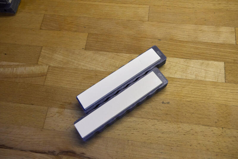2 darab, kétoldalas (#250/600) fenőkő furat: 4 mm Tartó méret: 136,5 x 26,5 x 23 mm Fenőkő méret: 152 x 20 x 5 mm súly: 170g