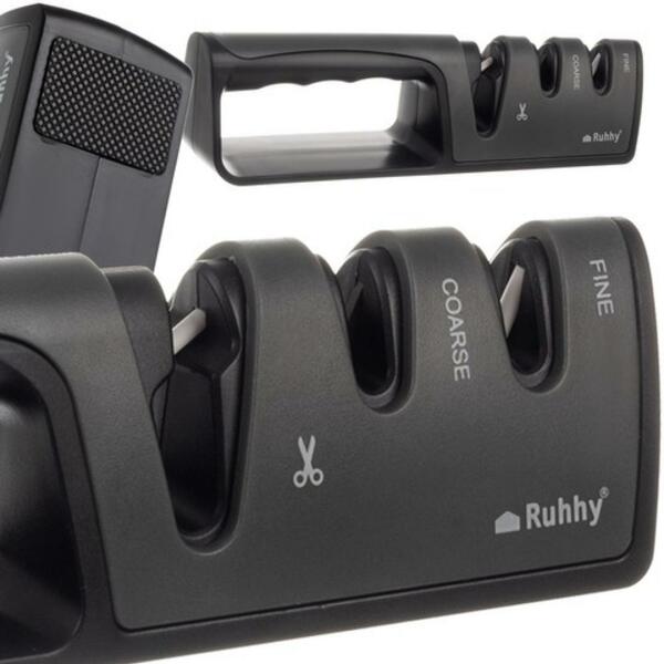 3 FÁZISÚ KÉS ÉS OLLÓ ÉLESEBB KÉTFÁZISÚ FIGYELMEZTETÉS _ KÉS I. FÁZIS EC OLLÓ ÉLESÍTÉSÉHEZ – Az élező 3 lyukkal van felszerelve, az első az olló élezésére szolgál, a következő kettő pedig a kések kétfázisú élezésére. GYORS ÉS HATÉKONY – egy élezővel könnyedén, gyorsan és nagyon hatékonyan élesíthetsz otthon minden kést és ollót, így azok tökéle