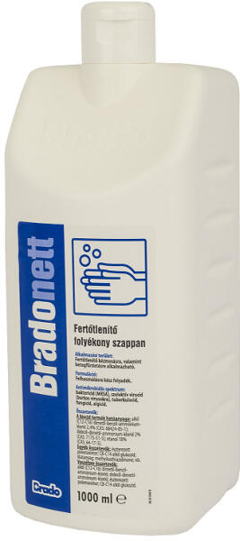 A Bradonett fertőtlenítő folyékony szappan egy fertőtlenítő hatású egyfázisú kéztisztítószer. Rövid behatási idő alatt hatékony a baktériumok (beleértve MRSA), gombák, és vírusok ellen is. Hatóanyagai miatt kifejezetten hatásos a CLOSTRIDIUM DIFFICILE fertőzések ellen is. A készítmény bőrápoló adalékot tartalmaz, ennek köszönhetően betegfürdetésre is alkalmas