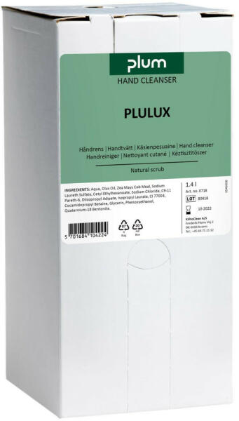 Plulux bag-in-box 1400 ml - Plulux kéztisztító 250 ml - Kéztisztító dörzsanyaggal, cement, festék, olaj, korom eltávolítására. - Nagy hatékonyságú ipari kéztisztító, dörzsanyaggal és visszazsírzó adalékkal, cement, festék, olaj, korom eltávolítására. - Kíméletesen távolítja el a ragacsos szennyeződéseket is (dízel és hidraulika olaj, korom, cement). - Kimondotta