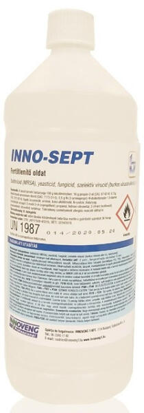 Inno-Sept Fresh fertőtlenítő oldat, 1 l - Kéz-, bőr- és felületfertőtlenítő oldal - Hatás spektrum: baktericid (MRSA), fungicid, virucid, tuberkulocid - Alkohol, kvaterner ammónium vegyület, alkilamin derivátum hatóanyagot tartalmazó kéz- és felületfertőtlenítő, amely alkalmas a kéz- és bőrfelület valamint egyéb alkoholálló felületek higiénés fertőtlenítésére. F