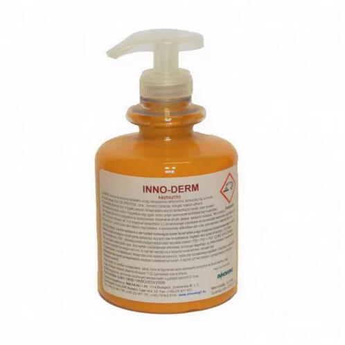 KÉZTISZTÍTÓ PASZTA PUMPÁS 500 ML INNO-DERM Folyékony kéztisztító erősen szennyezett kézre GHS piktogram: Figyelmeztetés: Veszély Figyelmeztető mondatok: H317 Allergiás bőrreakciót válthat ki. H318 Súlyos szemkárosodást okoz. H412 Ártalmas a vízi élővilágra, hosszan tartó károsodást okoz. A foglalkozásszerű felhasználásra készülő kéztisztító minden olyan terül