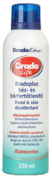 KÉZ- ÉS BŐRFERTŐTLENÍTŐ PUMPÁS 250 ML BRADOLIFE Kéz- és bőrfertőtlenítő pumpás 250 ml BradoLife A BradoLife kéz- és bőrfertőtlenítő kiválóan alkalmas a kezeid és a bőröd higiéniás fertőtlenítésére, akár otthoni körülmények között is. Nem csak a jól ismert baktériumokkal, de a gombákkal és vírusokkal szemben is védelmet nyújt. Gyorsan szárad. Nem ragad.
