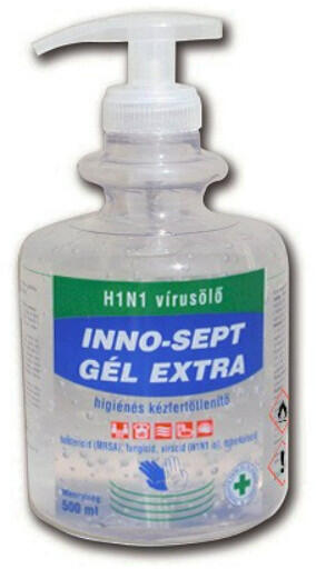 KÉZ- ÉS BŐRFERTŐTLENÍTŐ GÉL PUMPÁS 500 ML INNO SEPT GÉL EXTRA Higiénés kézfertőtlenítő GHS piktogram: Figyelmeztetés: Veszély Figyelmeztető mondatok: H225 Fokozottan tűzveszélyes folyadék és gőz. H319 Súlyos szemirritációt okoz. Higiénés kézfertőtlenítésre, foglalkozásszerű és lakossági felhasználók részére készült gél (terméktípus: PT 1). Alkalmazható