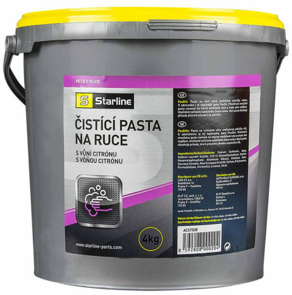 Starline ACST020 kéztisztító, 4kg Egy különösen krémes és bõrsemleges, faliszt bázisú tisztítószer. Ez az összeállítás garantálja a bõr védõrétegének megóvását, amit számtalan dermatológiai teszt is alátámaszt. A termék lényegében újratermelõdõ nyersanyagokra épül. A bõr károsítása nélkül kiválóan tisztítja az erõs szennyezõdéseket, mint olaj, zsí