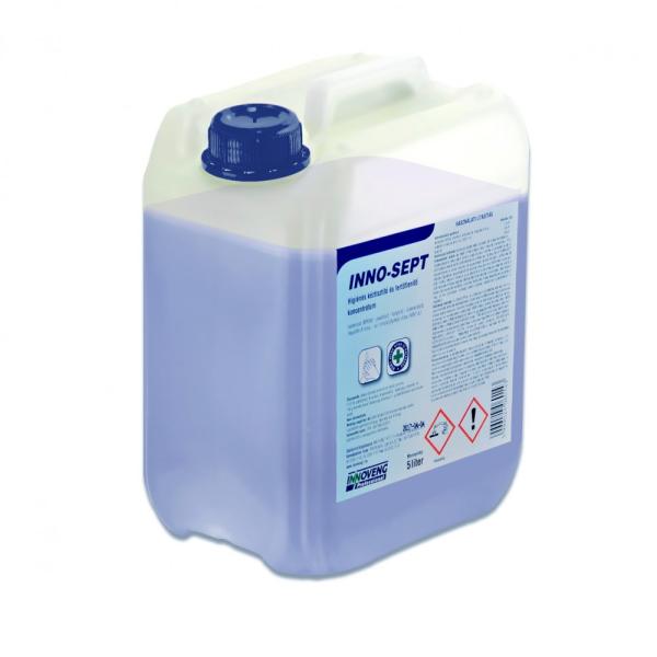 INNO-SEPT fertőtlenítő kéztisztító 5L - higiénés fertőtlenítő kéztisztító és betegfürdető koncentrátum - antimikrobiális hatásspektrum: baktericid (MRSA) – yeasticid – fungicid – tuberkulocid – Hepatitis B vírus – sz. virucid (burkos vírus, H5N1 is) - alkalmazási feltételek: Alkalmazás hígítás nélkül, behatási idő szobahőmérsékleten - felhasználási te